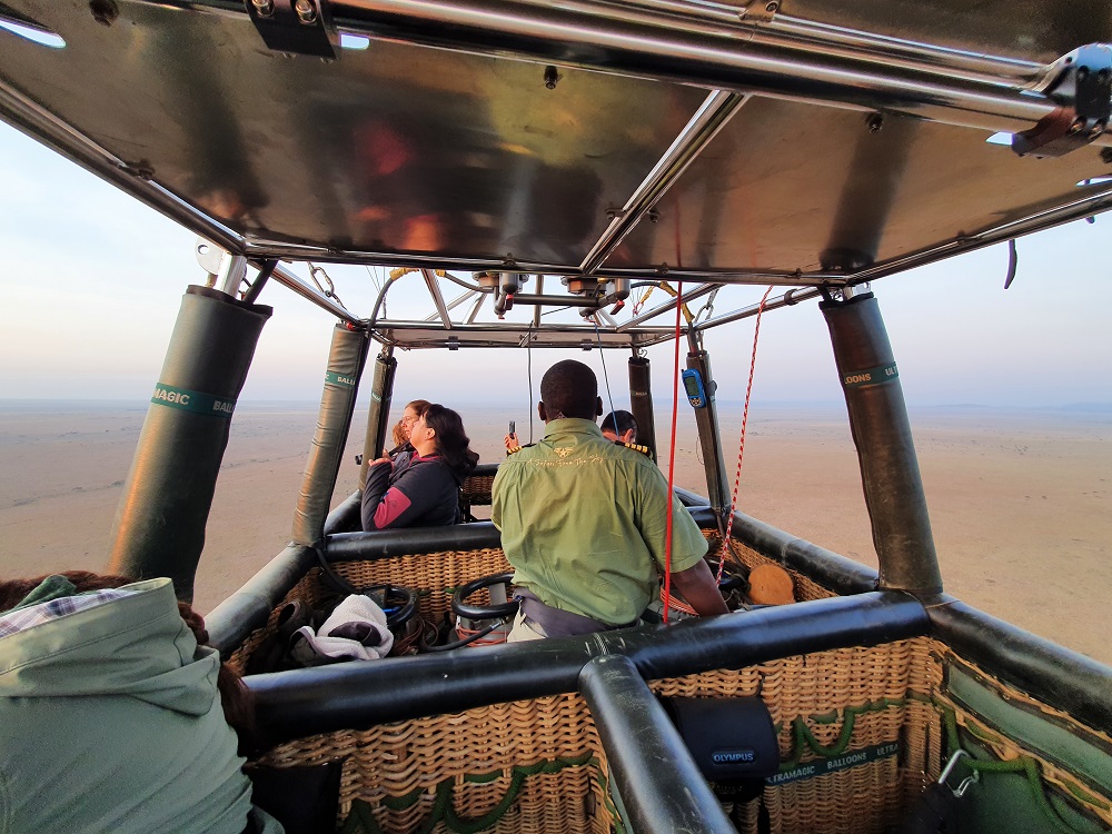 ”Vi stod tidligt op og blev hentet. Lidt i seks kom vi ombord, så vi kunne nå at flyve opn og opleve den smukke solopgang over den uendelige slette. Det er en af de vildeste oplevelser jeg længe har haft! Det er fuldstændig ubeskriveligt, at flyve i en luftballon, og se dyrene løbe nedenunder, mens solen står op. Det er svært at finde ord.